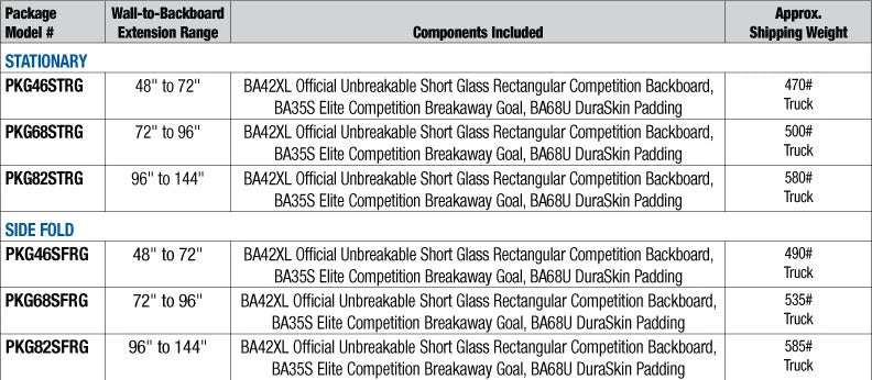 Swing left or right for storage close to wall without tools or ladders…Structures position backboard face anywhere from 48″ to 72″ from wall at time of installation without field modification • Available for immediate delivery • Extra heavy, steel tubular design with silver powder coated finish • Heavy, solid steel, machined pivot bushings with 5/8″ grade 5 pivot bolts (not just a hole drilled into tubing!) • Slotted mounting brackets for fine tuning goal height • Packages include structure, wall boards, support chains, Unbreakable 42″ x 72″ glass backboard, breakaway goal, DuraSkin backboard padding (choose from 17 colors), release hook, instructions and all mounting hardware except that required to anchor wall boards to wall • If you need height adjustability, purchase optional goal height adjusters • Lifetime limited warranty on wall mount structures.Â